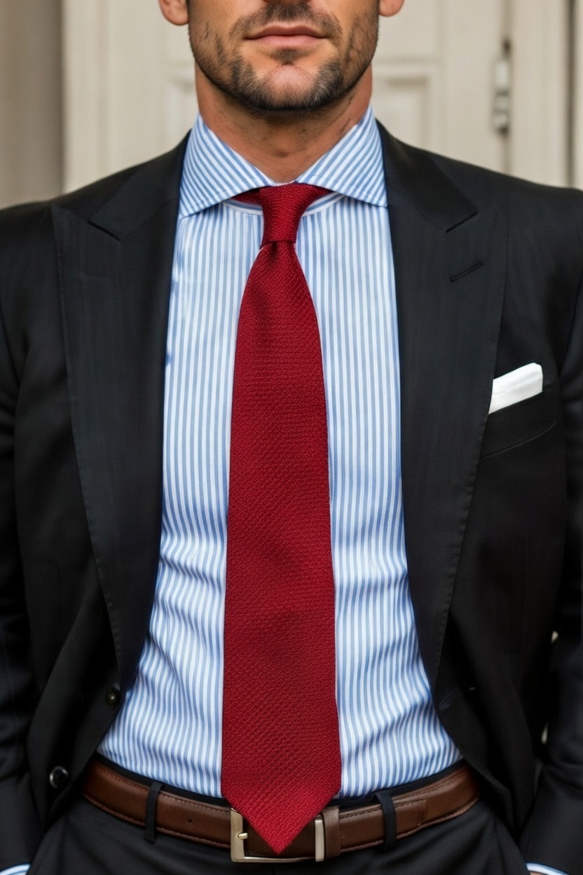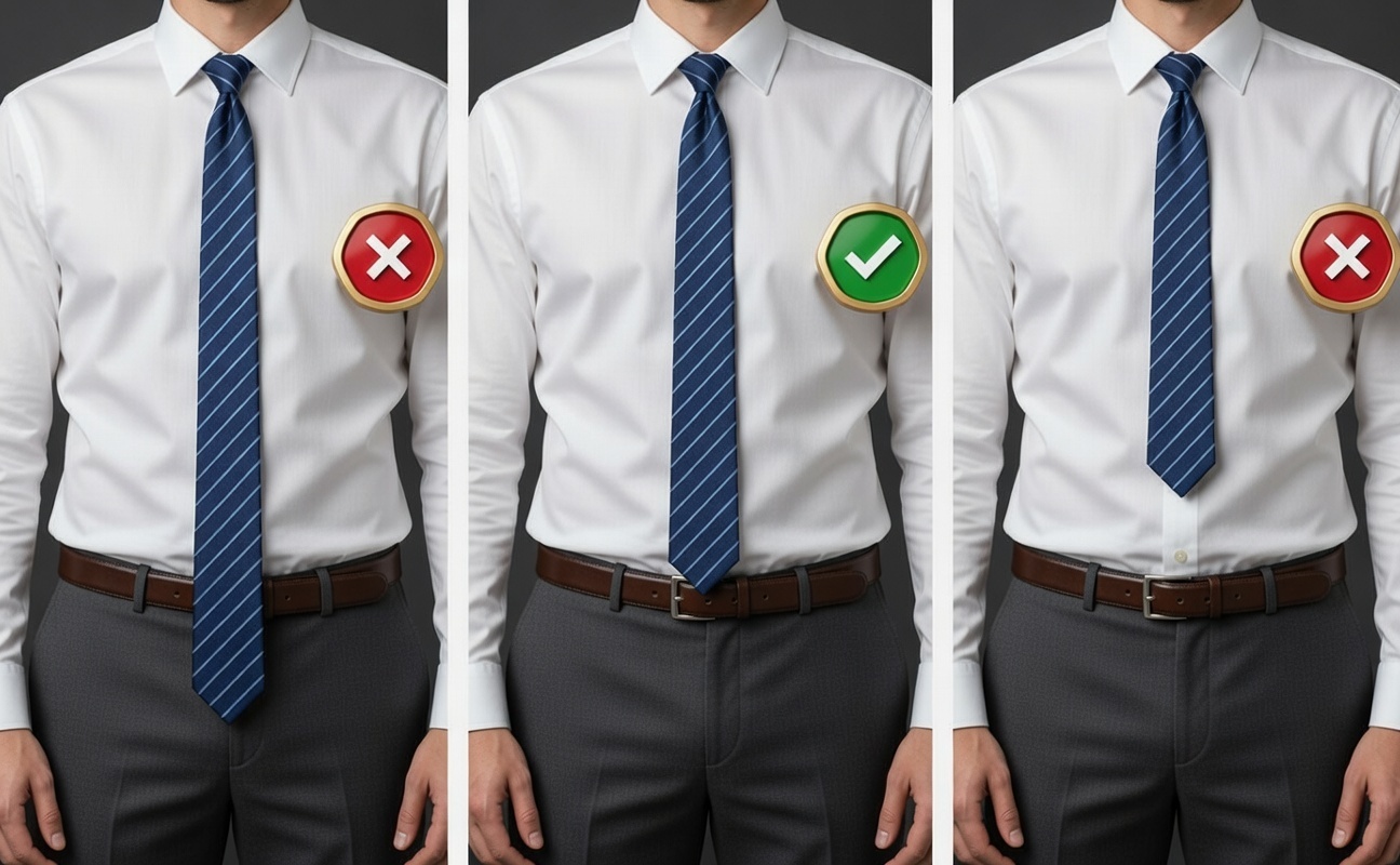 Главное правило остаётся неизменным: нижний край галстука должен слегка касаться верхней кромки ремня (или пояса брюк). Всё, что выше или ниже — уже ошибка, которую заметят даже те, кто не разбирается в моде.