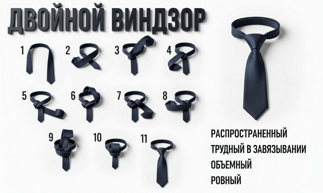 Полный Виндзор — самый объёмный и «прожорливый». Подходит для широких воротников сорочек, но требует хорошего запаса длины. Полувиндзор — золотая середина: аккуратный, не слишком массивный. Простой (четвертной) — самый экономичный, идеален для узких галстуков и slim-образов.