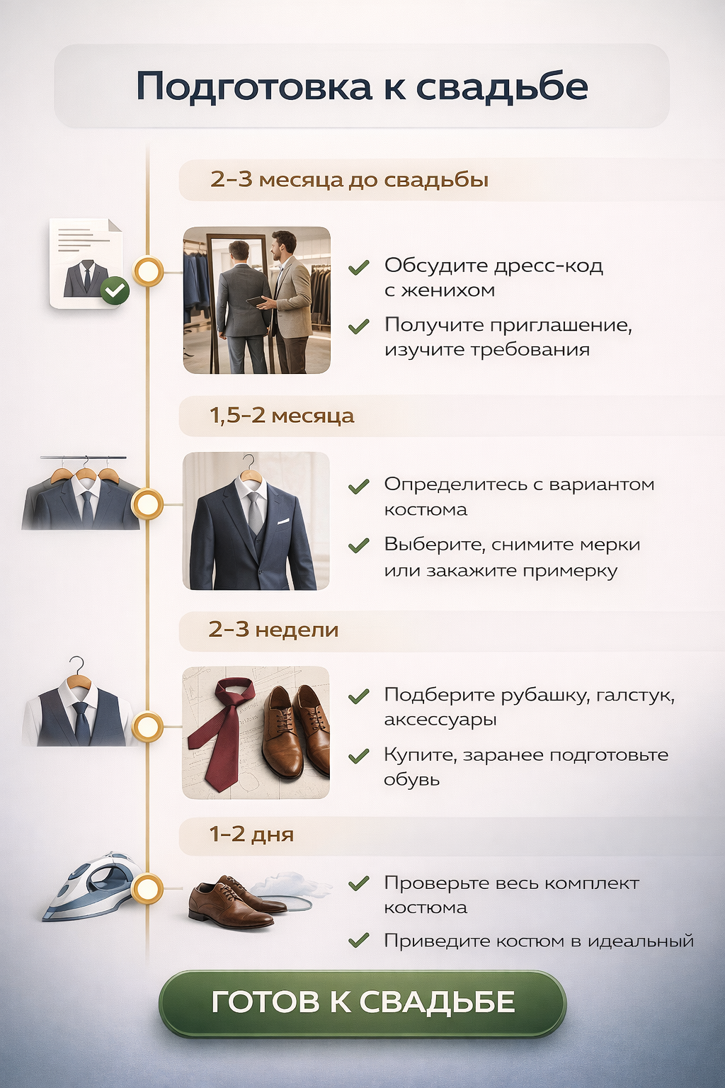 И помните: костюм — это не просто одежда. Это ваша визитная карточка, ваша уверенность и ваш способ показать уважение к молодожёнам.